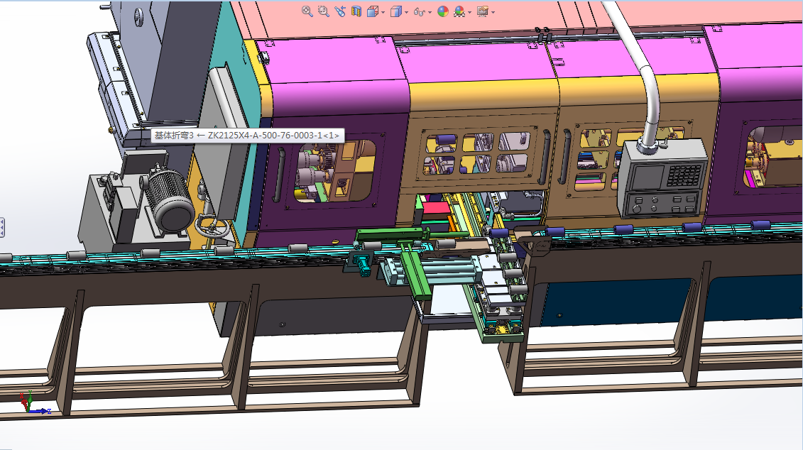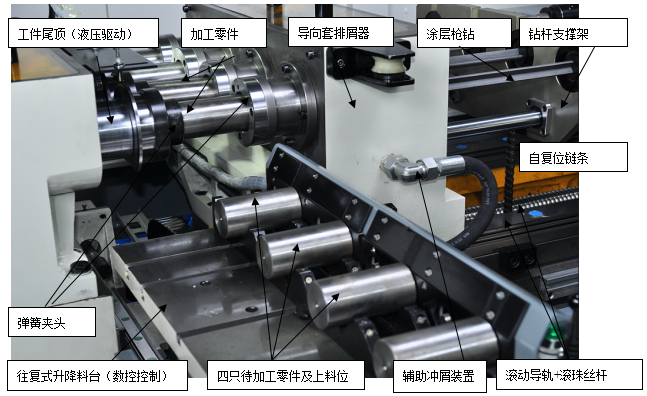 機(jī)床具備四主軸、八工位設(shè)計(jì),工件采用彈簧夾頭通過零件外圓自動定位夾緊。機(jī)床配置伺服驅(qū)動數(shù)控控制的自動往復(fù)升降式上料臺,其料臺的數(shù)控橫移、升降以及固定的上下料區(qū)域設(shè)計(jì),均可使機(jī)床以極好的適應(yīng)性匹配適宜的如桁架機(jī)械手或六軸機(jī)器人或功能氣缸等自動化形式,槍鉆工序的整個加工過程則在數(shù)控方式下實(shí)現(xiàn)了完全的自動化加工。